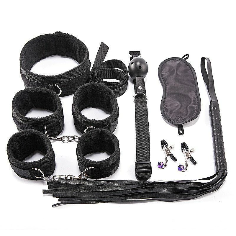 kit sado composto por mordaça, venda, coleira com estirante, guia, chicote, algema e tornozeleira e